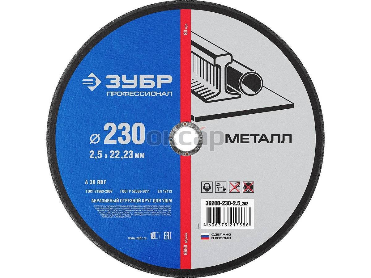 Характеристики товара "Круг отрезной Зубр 230-2,5-22 мет. 36300-230-2,5"